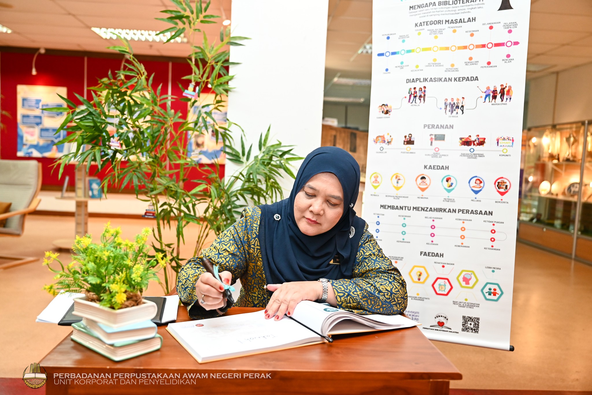 Majlis turut diserikan dengan ceramah bertajuk “Merawat dengan Naratif: Aplikasi Biblioterapi di Institusi Pendidikan” yang disampaikan oleh Prof. Madya Dr Wan Satirah Wan Mohd Saman, Pensyarah Kanan Fakulti Sains Maklumat, Universiti Teknologi MARA (UiTM) Shah Alam. Program ini diharap dapat menjadi pemangkin kepada pelaksanaan lebih banyak aktiviti berasaskan biblioterapi di pelbagai peringkat komuniti.